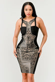 Introducing the \"Athina Aztec Dress,\" where elegance meets edgy sophistication. This fitted knee-length dress captivates with its intricate lace detailing that creates a stunning illusion of sensuality and class. The solid black panels strategically placed along the sides and center not only enhance the figure but also add a sleek contrast to the delicate lace overlay. The grommet accents bordering the lace offer a touch of boldness, while the scoop neckline and tank-style straps provide a comfortable and secure fit. Made from a blend of fabrics that ensure stretch and comfort, this dress is a perfect choice for an evening event or a special night out. It's a piece that promises to make a statement with its blend of daring design and classic allure.