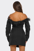 Turn heads with our Off-Shoulder Lace Blazer Dress, a sultry and sophisticated take on power dressing. This blazer dress blends structure with romance, featuring a tailored double-breasted design and delicate lace detailing along the off-shoulder neckline. The lace trim adds an ethereal, feminine touch, while the sleek black fabric ensures an effortlessly chic and polished finish.