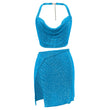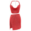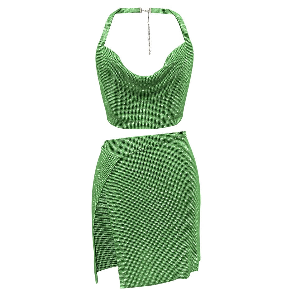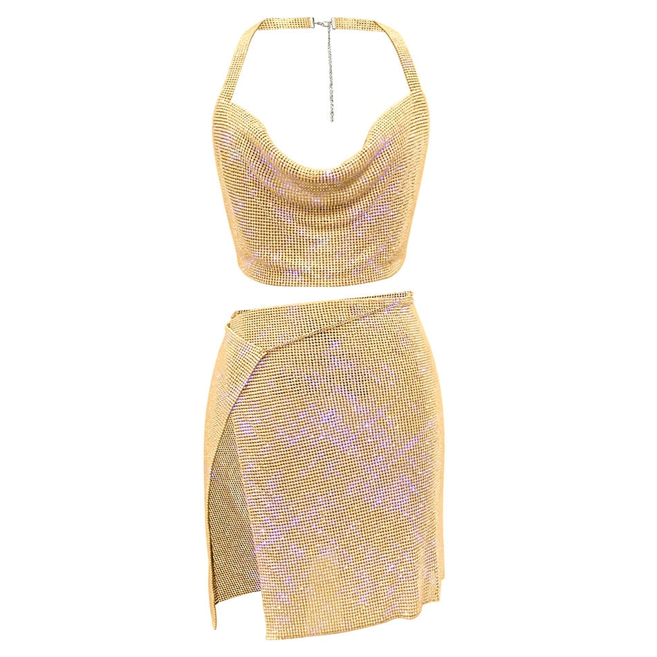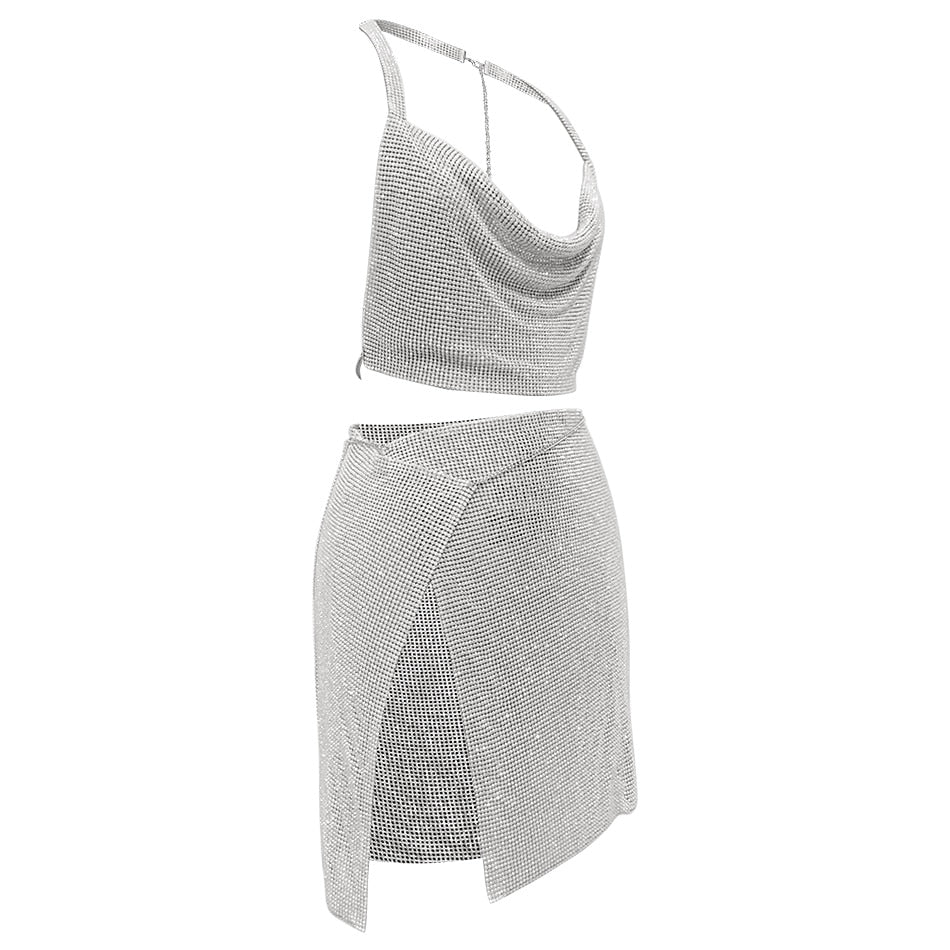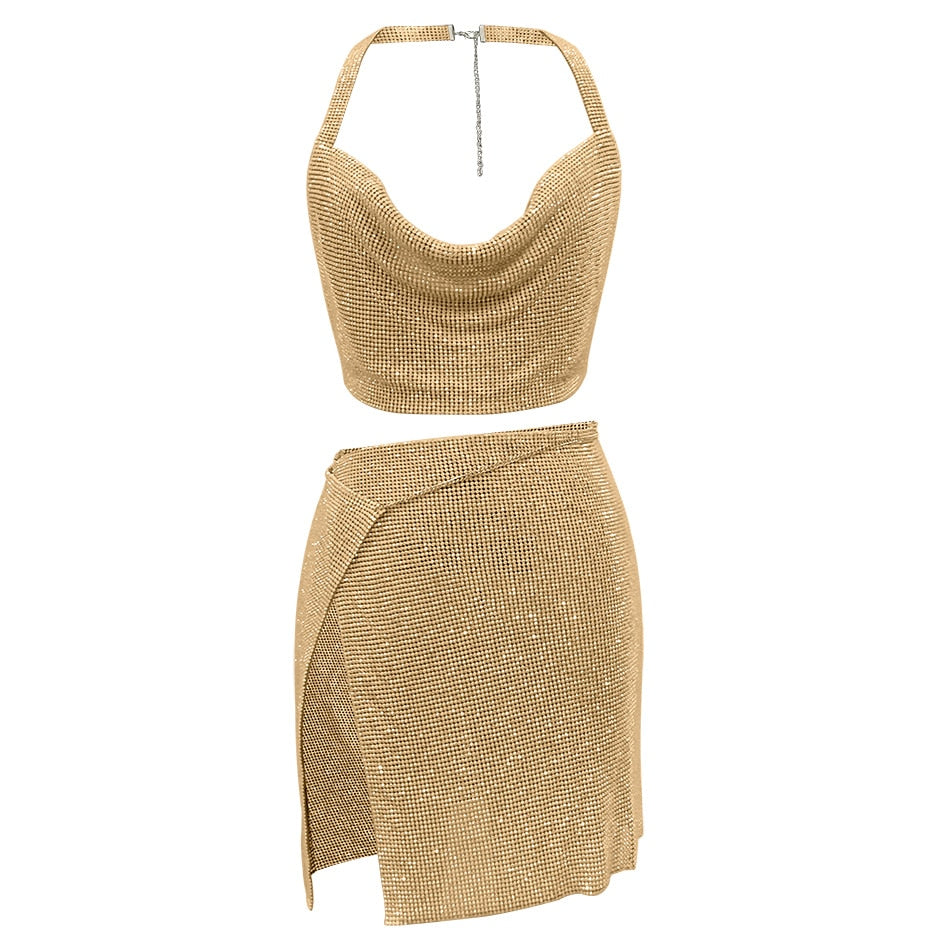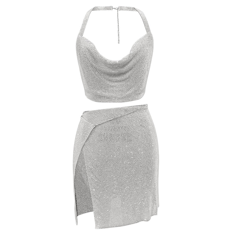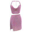 Tropez - Rhinestone Crystal Mesh Halter Crop Top Wrap Mini Skirt Set