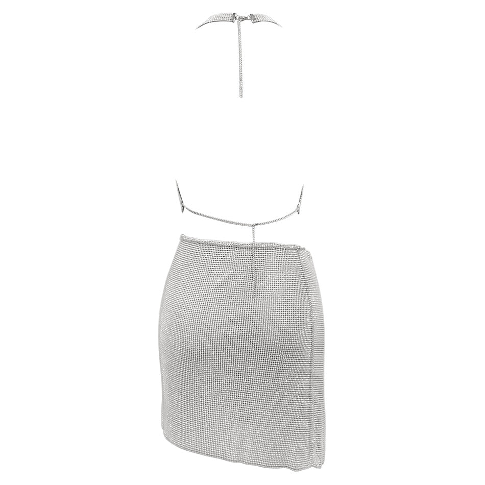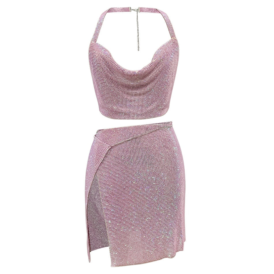 Luxurious crystal mesh rhinestone halter crop top and wrap mini skirt set.